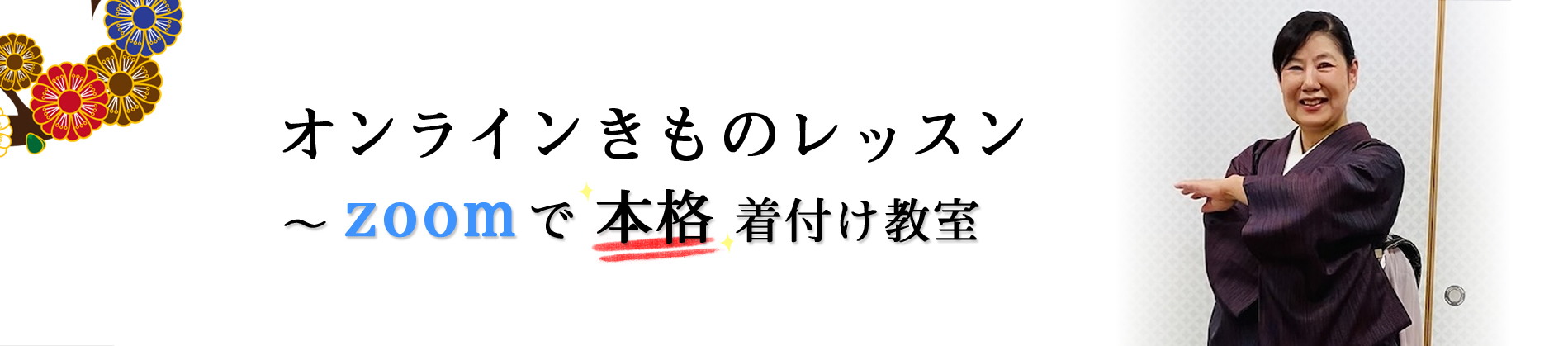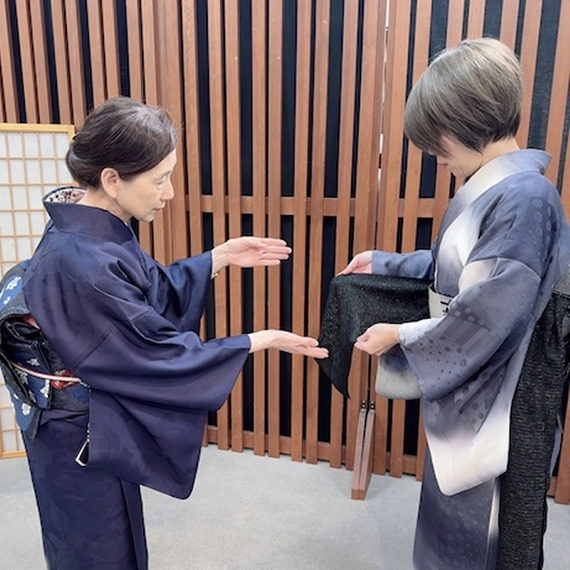 手が上がらなくても自分で楽にお太鼓が出来る【早比楽美装前結び】をお勧めしています。「綺麗な着姿」にこだわり、生徒一人ひとり納得がいくまでお稽古をしてもらえる、4回復習コースが大人気です。